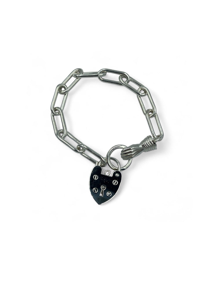 Handmade in sterling silver, this bracelet features bold, elongated links that strike the perfect balance of strength and elegance. At its centre, a sculpted clasp hand holds a vintage-inspired heart-shaped padlock — a timeless symbol of love, loyalty, and trust. Romantic and enduring, it’s a piece to wear close every day or gift as a lasting token of devotion.
